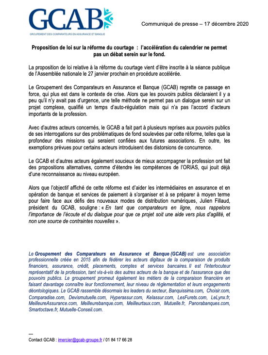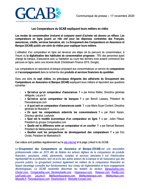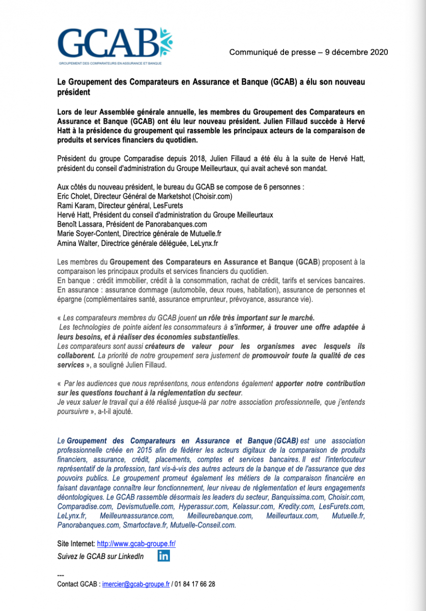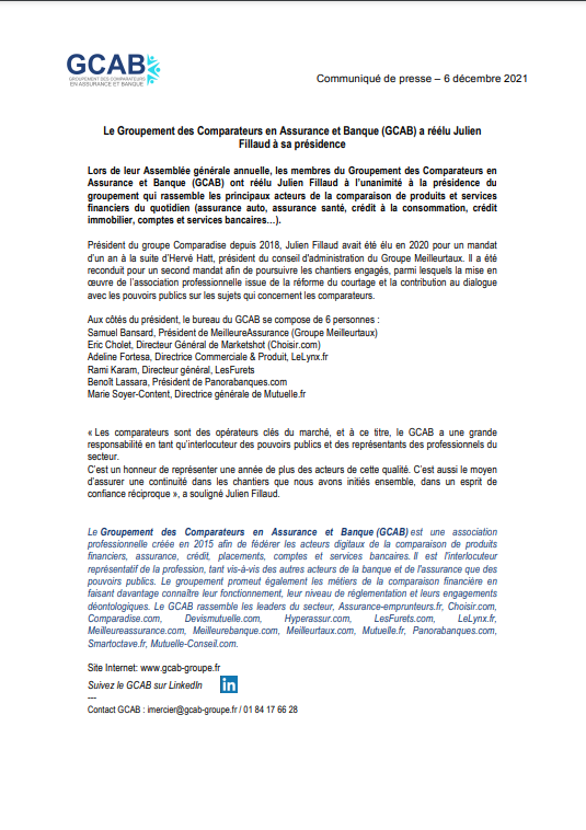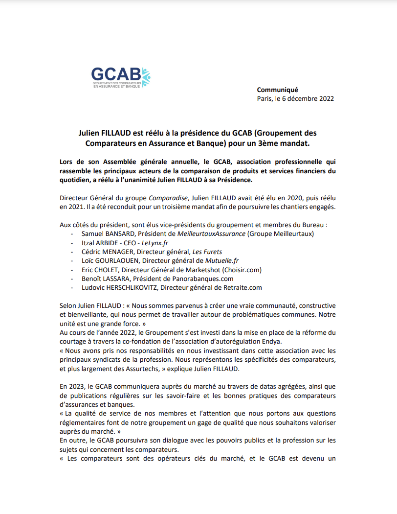 Julien FILLAUD est réélu à la présidence du GCAB (Groupement des Comparateurs en Assurance et Banque) pour un 3ème mandat.