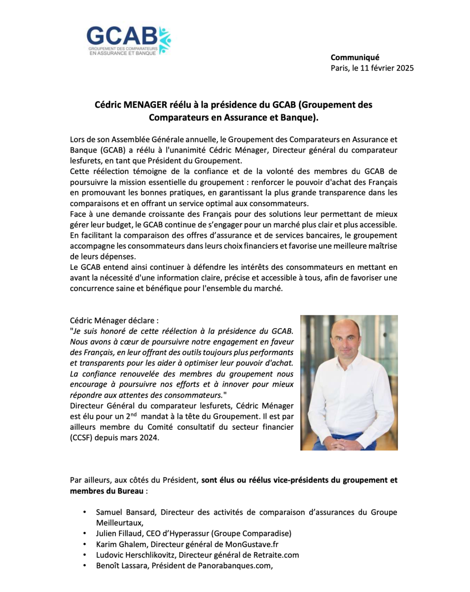 Cédric MENAGER réélu à la présidence du GCAB (Groupement des Comparateurs en Assurance et Banque).