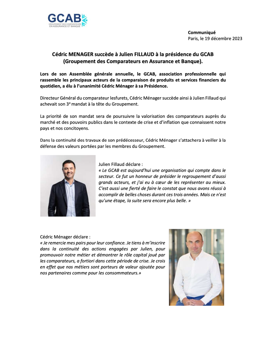Cédric MENAGER succède à Julien FILLAUD à la présidence du GCAB (Groupement des Comparateurs en Assurance et Banque).