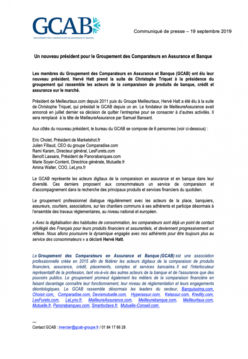 Le Groupement des Comparateurs en Assurance et Banque (GCAB) a élu son nouveau Président.
