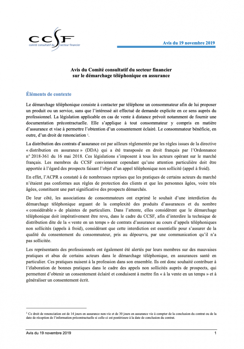 Avis du Comité consultatif du secteur financier sur le démarchage téléphonique en assurance