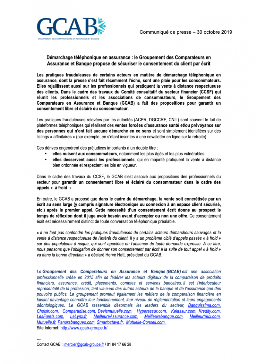 30/10/19 Démarchage téléphonique en assurance : le Groupement des Comparateurs en Assurance et Banque propose de sécuriser le consentement du client par écrit